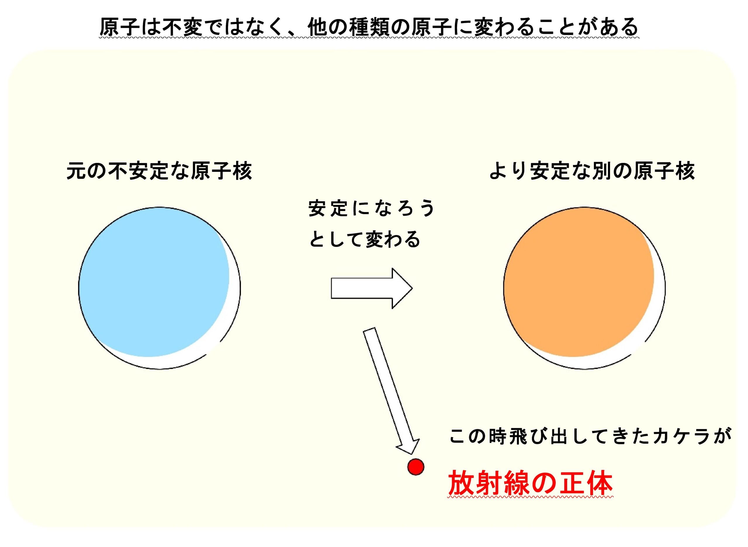 放射性物質、つまり放射能を持つ原子は放射線を出すと別の種類や状態の原子に変わります。