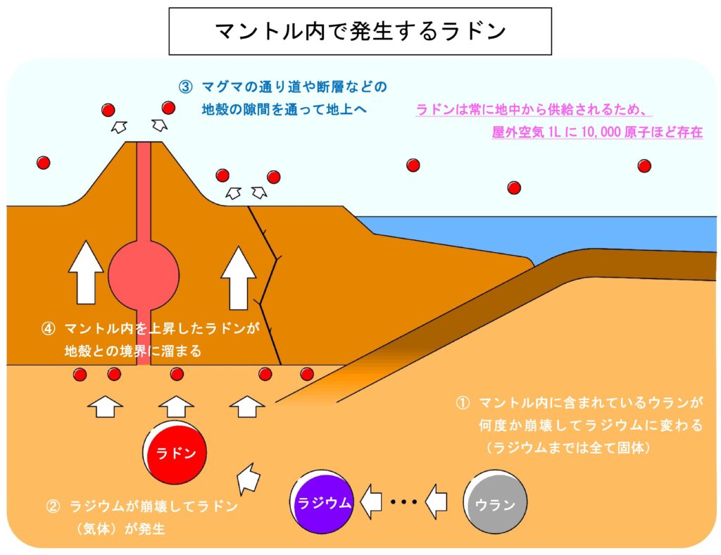 ラドンの同位体の1つであるラドン222の発生源は一般に地殻中のウラン鉱脈であると言われることが多いですが、実際のところ大気中のラドンのほとんどは地中深くのマントルに含まれているウラン238から生み出されています。