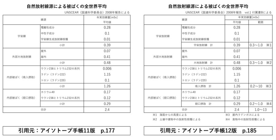 日本アイソトープ協会発行の「アイソトープ手帳」は放射線の専門家が調べたいことができたら真っ先に開けるものです。アイソトープ手帳は第11版(2011年発行)にはラドンによる被曝量のバラツキすら書かれていませんでした。第12版(2020年発行)からはラドンによる被曝量の広がりが0.2〜10mSvと正しく書かれるようになりましたが、そのコメントは「屋内のラドンガスによる」と書かれています。このコメントではラドンガスの濃い住居はウラン鉱山付近のような地理的要因で発生するのか建物の気密性が上がったため重いラドンが建物の下部に蓄積するのかはわかりません。