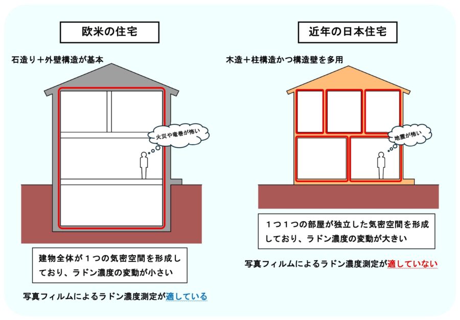 ここで問題となるのは、アメリカ等の欧米諸国で使用された写真フィルム型検出器はラドン濃度が1年を通じてほとんど変化しない場所での測定を前提にしており、あくまで欧米諸国の住宅構造に適した運用がされていた、という点です。