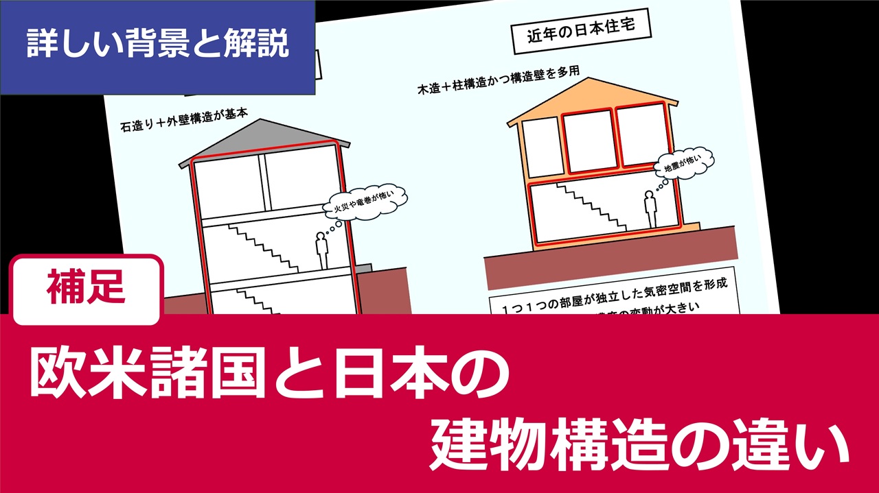 一方、日本の建物は柱構造を基本としており、内部が小さな部屋に分かれていて一部屋ごとに密室となっている場合が多数見受けられます。これは日本で最も危険な災害が地震であることが起因しており、多くの個人住宅が木造であることを含めてかすがいを入れた構造壁を多用していることも特徴的です。