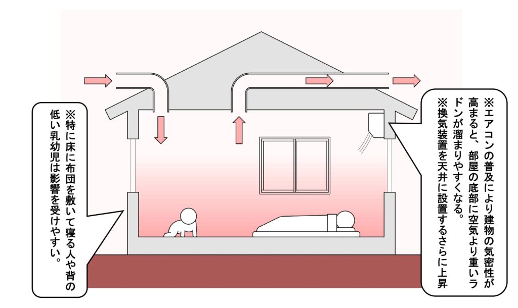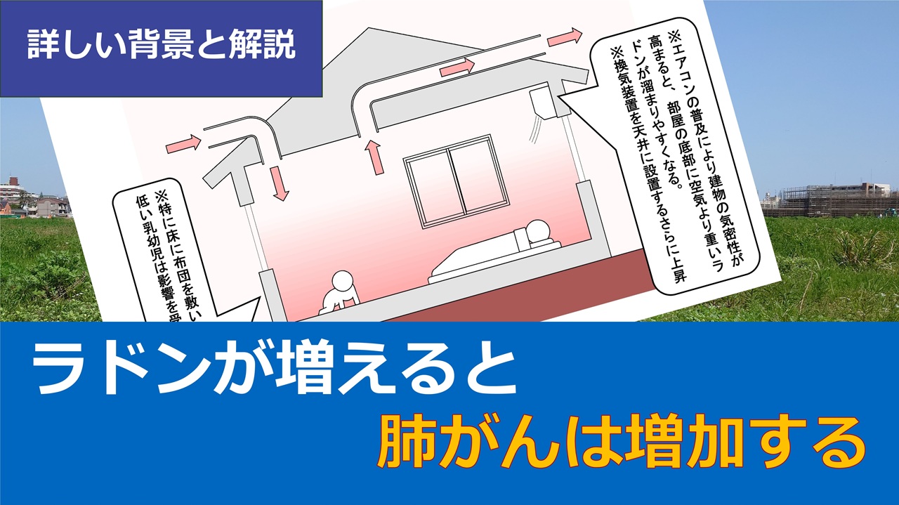 そして2008年報告ではラドンの影響は鉱山内部や地下施設だけでなく、私たちが暮らしている一般の住宅においても「エアコン普及によって建物内の気密性が向上し、空気よりも重いラドンが室内の底部に蓄積し、それによって人へのラドン被曝が増加している」という指摘が出されたのです。