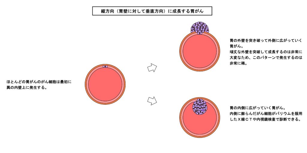 現在では硫酸バリウム造影剤を使ったX線CT撮影や内視鏡診断によって、内側に成長する胃がんは診断できます。また胃の外側に成長する胃がんはそもそも頑丈な胃の外壁を突破するのが困難なため発生自体が稀です。胃の外側に飛び出せば昔ながらのX線撮影で発見できます。治療法も進化し、末期がんでも胃の全摘出手術は少なくとも延命効果はあり、部分摘出手術や内視鏡手術は完治する可能性があります。現在縦に成長する胃がんで死亡する人の多くは胃がん健康診断を受けない人でしょう。