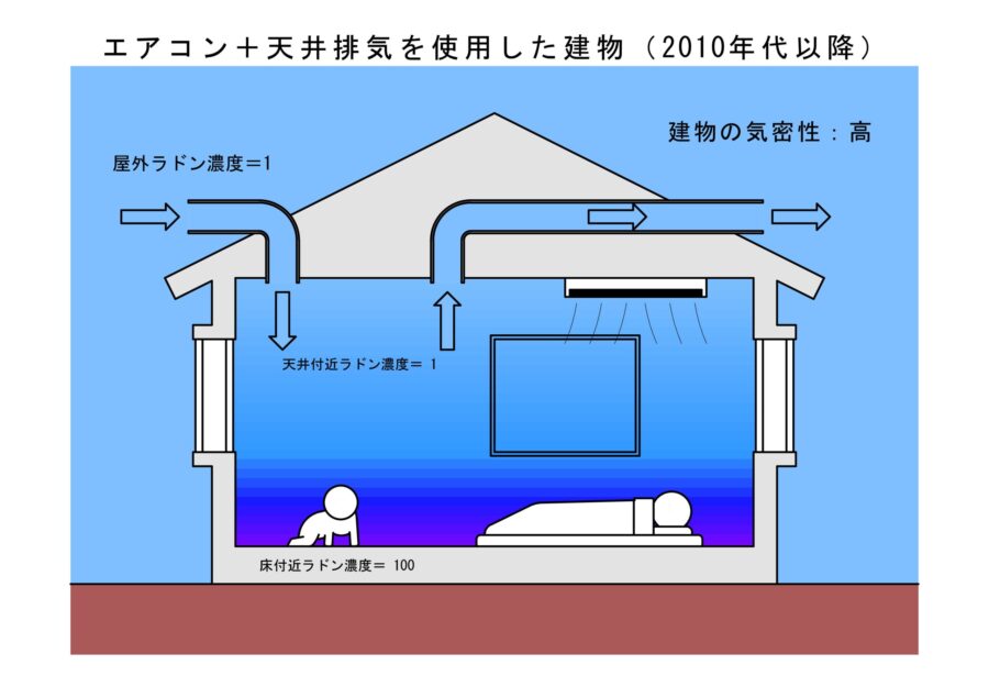 エアコンの普及によって建物の気密性が高まり、部屋の底部にラドンが蓄積しやすくなったという説明を受けて「自分の家は換気装置がしっかりしているから大丈夫」と思われる方がいるかもしれません。