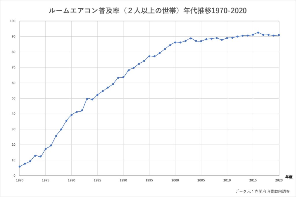 上の2つのグラフは国内におけるルームエアコンの普及率を示したグラフと、国内における年間肺がん死亡者数のグラフです。